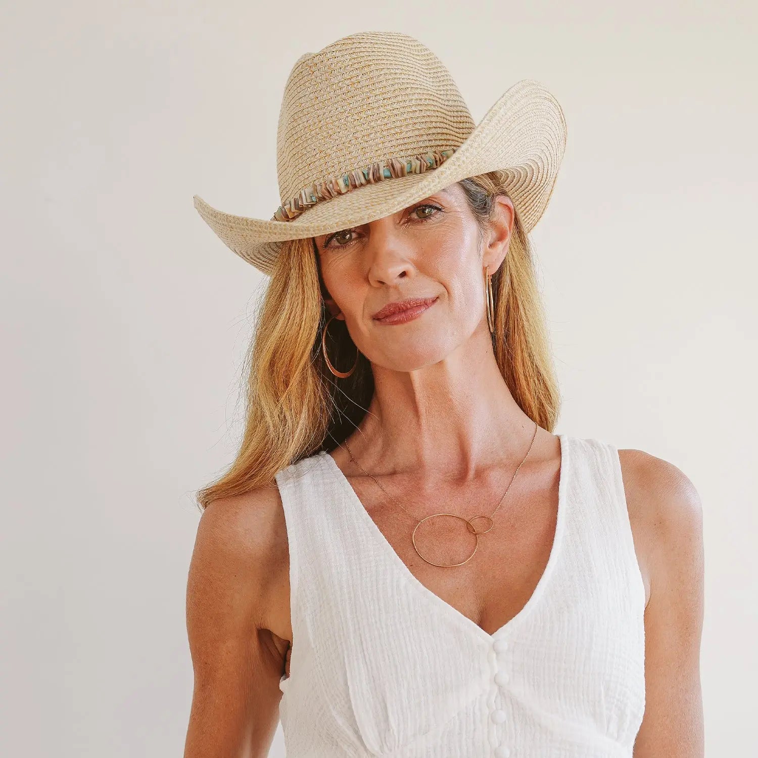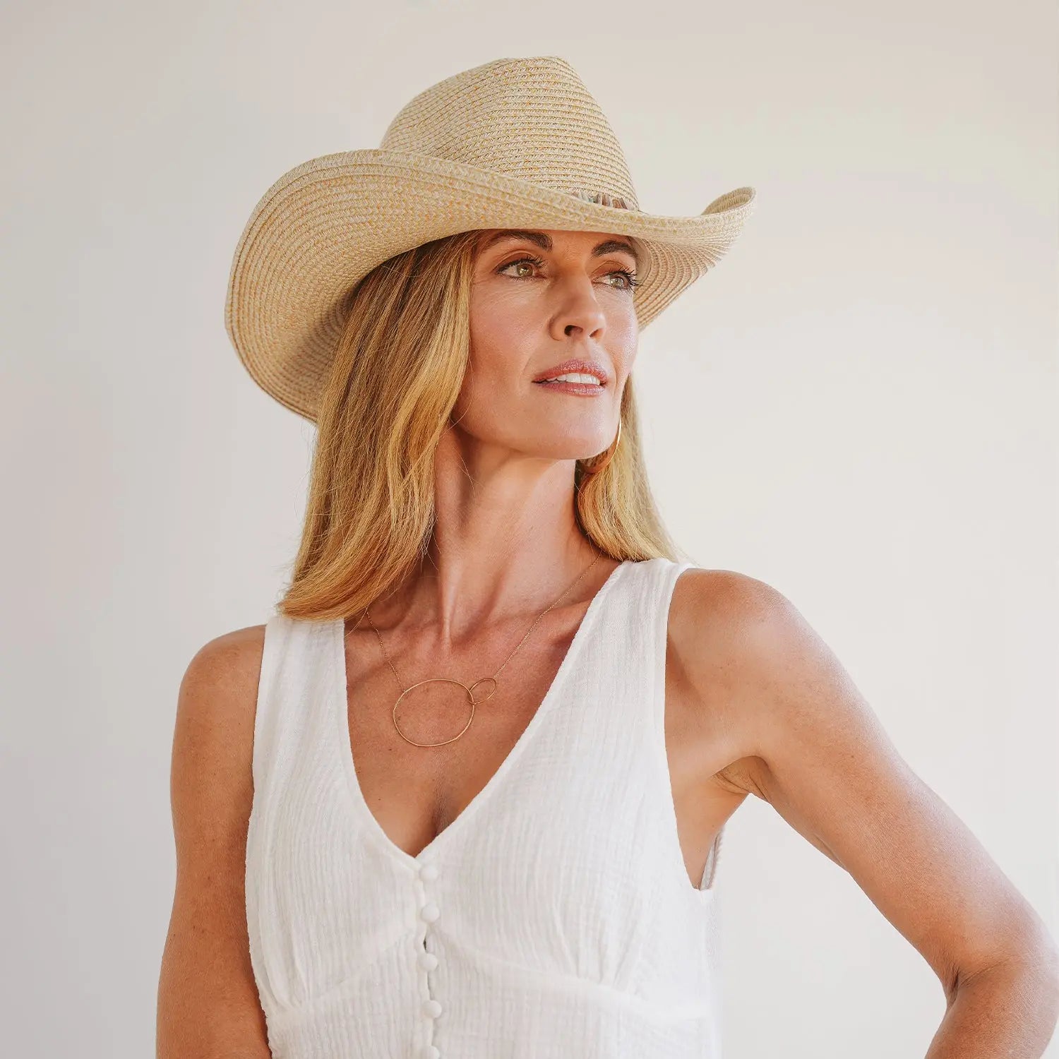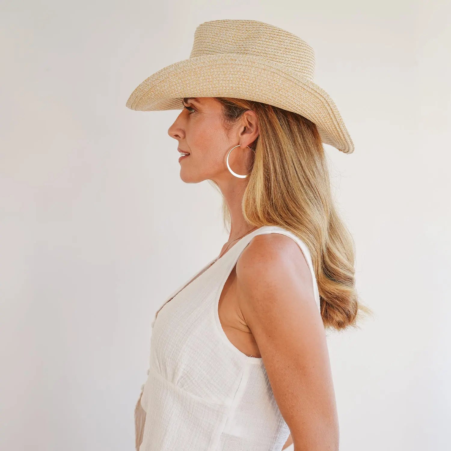 De Gillaroo is een op cowboy geïnspireerde strandhoed, ontworpen voor zonovergoten dagen en een moeiteloze stijl. Met een bredere rand van 9 cm en een geknepen kroondetail biedt hij UPF50+ bescherming tegen de zon en een relaxte surfergirl-uitstraling. Draag hem omgeslagen of recht: deze zomerklare hoed kun je plat opbergen en licht meenemen.
