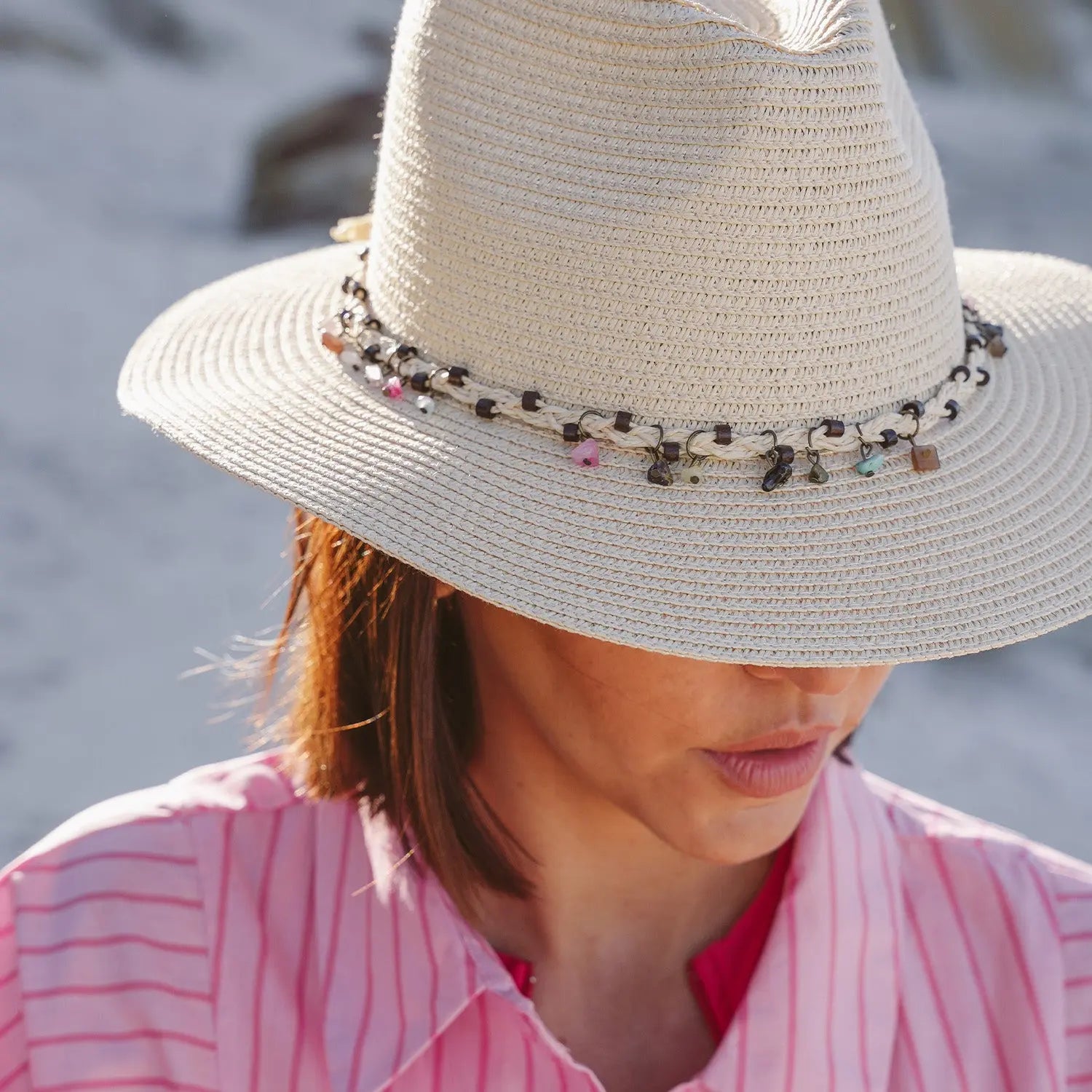 De Emily Fedora is een leuke zomerzonnehoed voor dames, verkrijgbaar in helder wit of naturel, afgewerkt met een kleurrijke touwversiering met kralen rond de kroon. Lichtgewicht, ademend en gemaakt voor zonnige dagen.