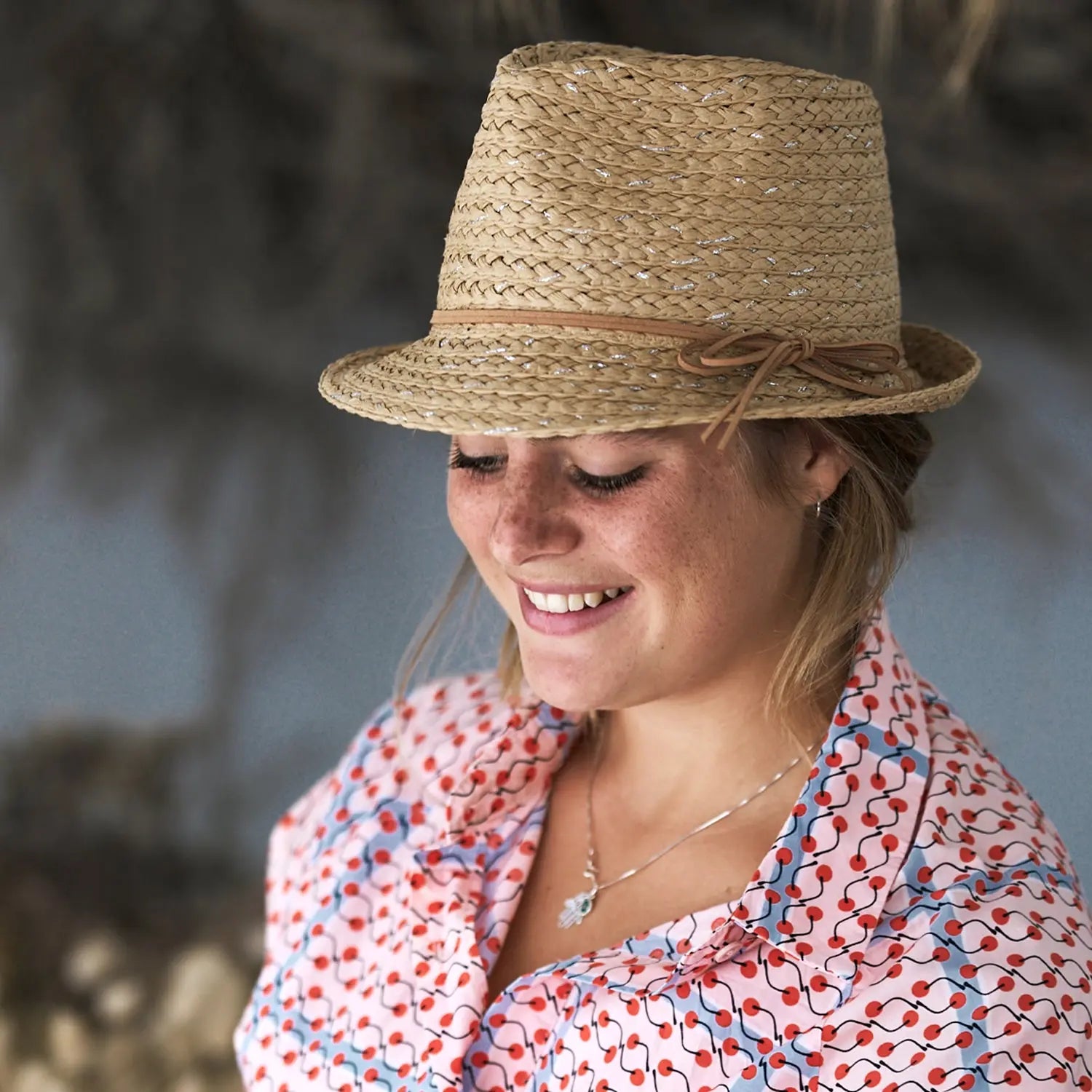 De Zinnia Trilby is een speelse, nonchalante zonnehoed die net zo helder straalt als jouw avonturen in de buitenlucht. Met een lichtvangende afwerking. zilverkleurig Lurex is in de vezels geweven.Deze hoed voegt precies de juiste hoeveelheid glamour toe, terwijl hij je koel en beschermd houdt.